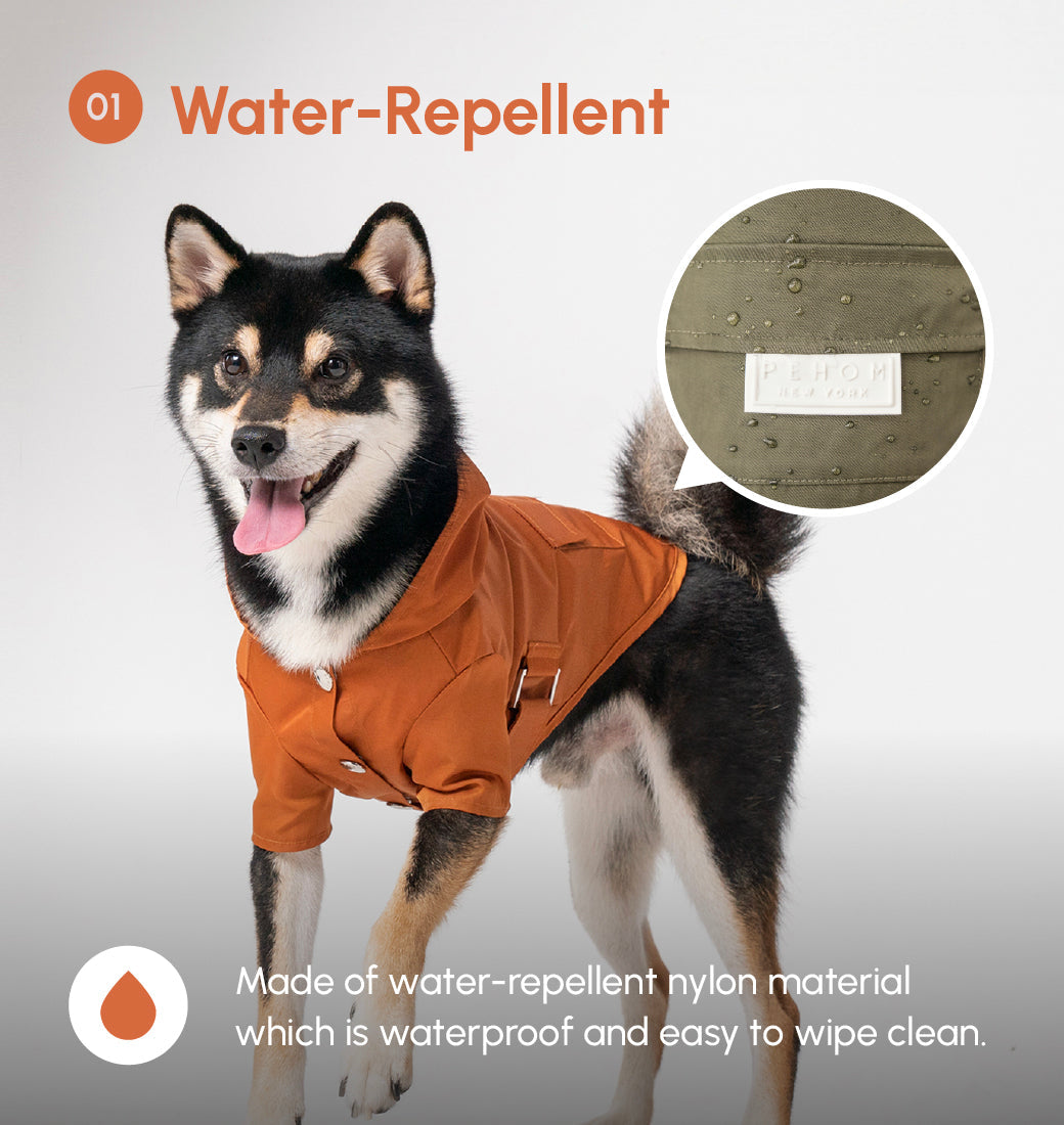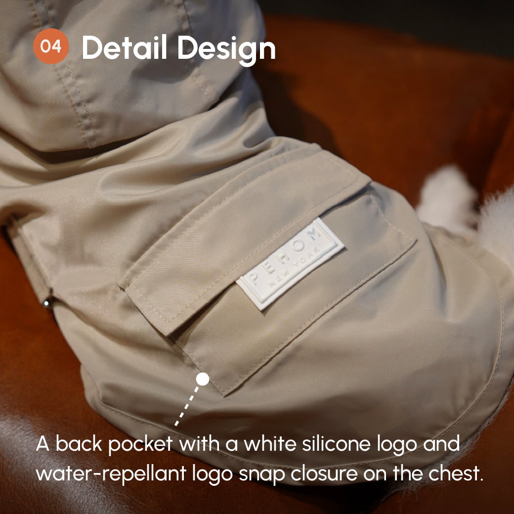 - Water repellant logo snaps closure on chest