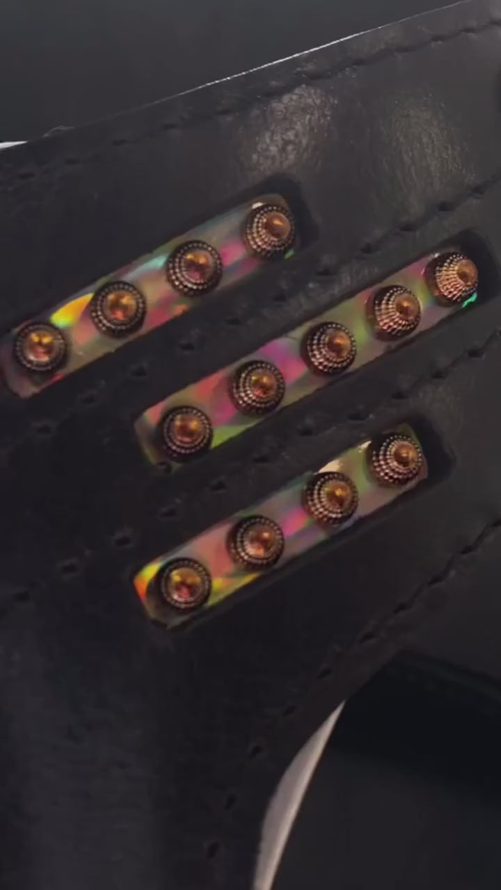 The base is crafted from the highest quality black genuine leather , providing a luxurious foundation, while the details are made from exceptional "chameleon" leather that reflects every color of the rainbow. This stunning material adds a captivating element, creating a dynamic visual experience that changes with the light. The inner layer has our distinctive soft padded leather cushion for extra comfort.